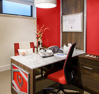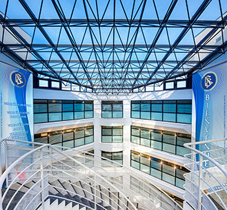 受付の上の6階は、建物の見事で壮大な吹き抜けになっています。 デザインは、複雑なリーフパターンが並んだ螺旋階段など、セコイアの意匠化です。